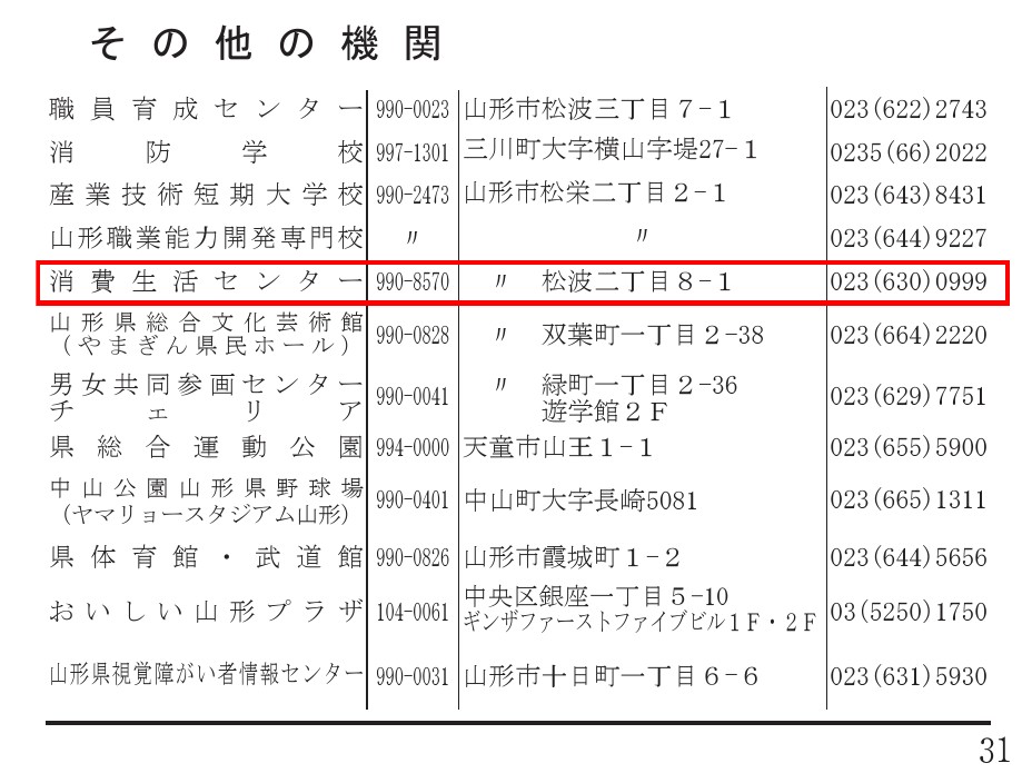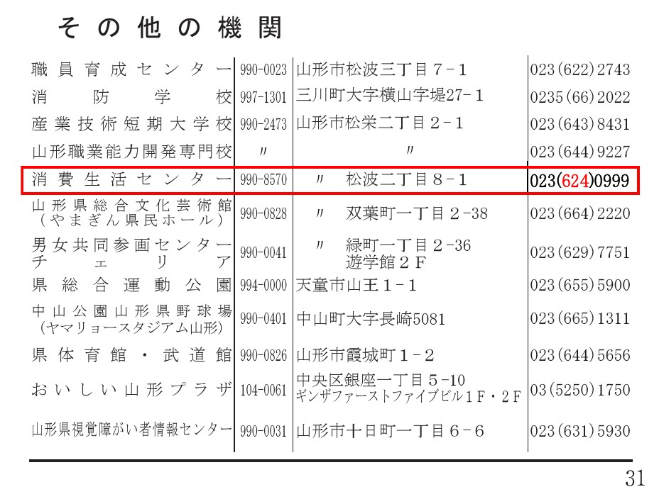 | ▶資料編 扉ページ 第72回統計グラフ全国コンクール 総務大臣賞 第74回山形県統計グラフコンクール 山形県知事賞 受賞者、山形県立致道館中学校 1年(受賞時) 柳沢さくらさん のお名前に誤りがありました。 お詫びして訂正いたします。 誤 ![]() ▶名簿編 31ページ 県の機関>その他の機関 消費生活センターの電話番号に誤りがありました。 正しくは下記のとおりです。 誤 ![]() |
